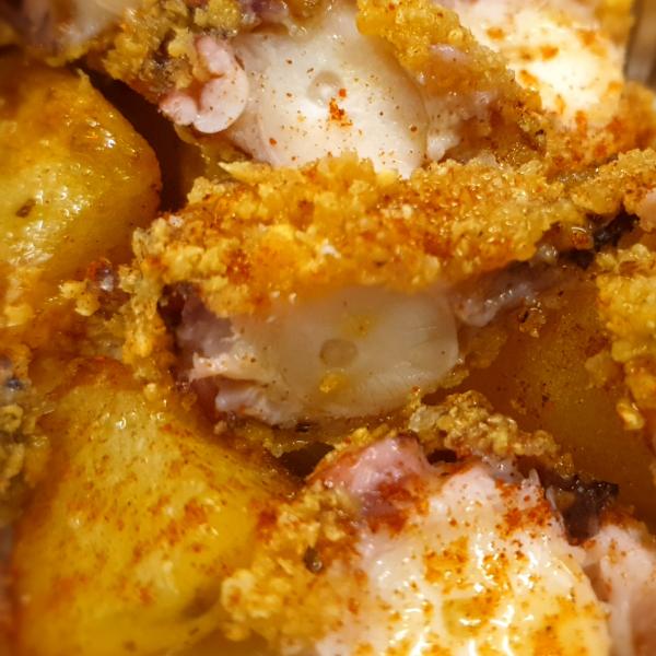 Pop arrebosat cruixent, patates i mayonesa citrica